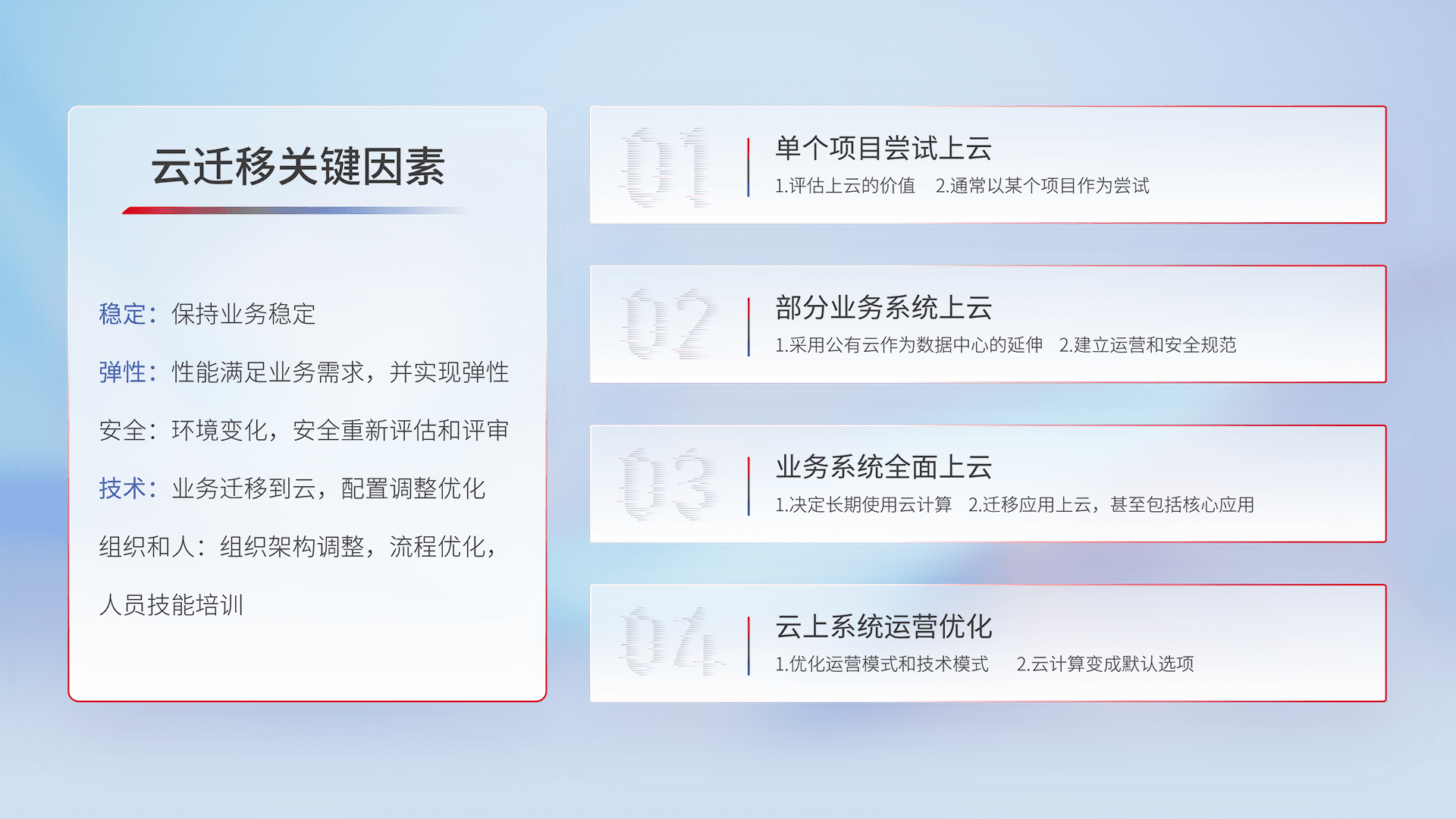 结合实际业务,,,,从规划设计、、云平台选型、、、云原生改造、、、、数据迁移、、、、集成交付,,迁移全过程为客户识别最佳上云路径,,做好风险识别管理,,,设计网络架构、、身份权限、、、、安全审计合规、、、操作审计、、日志审计、、监控告警策略、、多站点容灾设计等,,对云上基础设施进行整体规划,,,,提升IT治理水平,,,,以满足弹性、、高可用、、高性能的需求。。
