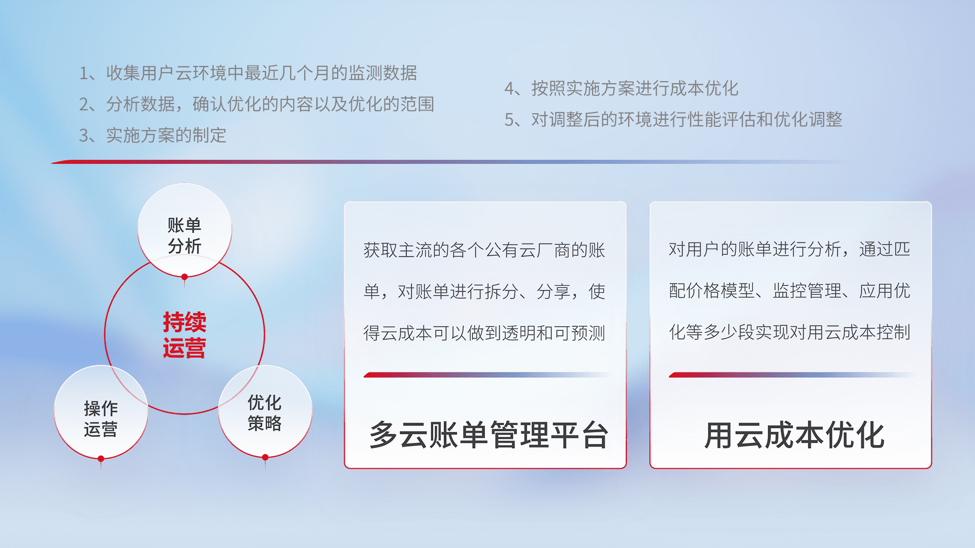 通过多云纳管,,,以统一的资源数据模型把客户的云资源进行抽象和封装,,,进而实现对多云资源的统一操作,,,保障云资源管理的可靠性、、、稳定性与可用性。。量身定制化运维内容,,,,配置、、、开发运维、、、补丁管理、、、备份、、、、监控、、认证和访问管理、、、审计和日常巡检等,,保障在用云过程中的可靠度,,,稳定度以及高可用率。。