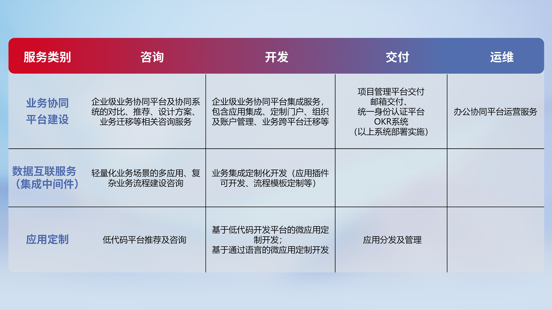 针对钉钉、、企微、、IDaas等平台级产品提供产品的规划、、、、方案、、交付、、、定制化开发等服务,,,,实现如统一协同办公、、智能客户服务、、混合会议管理、、、、智能数据查询、、等业务场景,,,,实现数字化转型。。